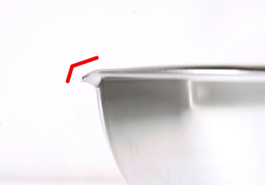 一般的なボウルの注ぎ口は1段階の突き出しが多いですが、当製品はキレの良さにこだわり、突き出しを2段階に折り曲げた独自形状を採用。液体が注ぎ終わったあとに自然とボウル内へ戻りやすく、注ぎ口に液が残りにくいため、液だれを防止。特にドレッシングや卵液など、複数回注ぎ入れる場面でもスッと切れて、調理中のストレスを軽減します。