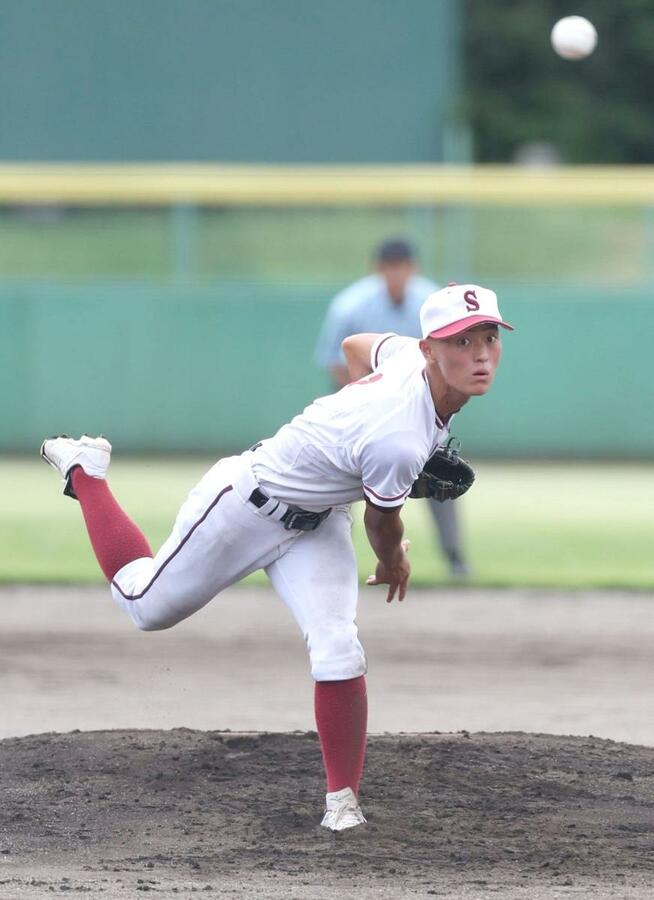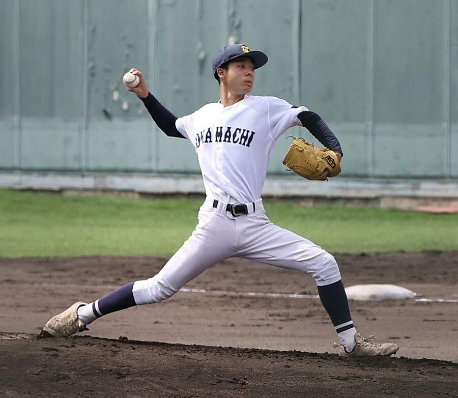 新発田農-新潟商 新潟商の先発大島岳留=新発田市五十公野