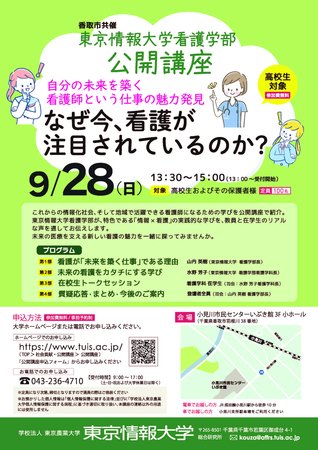 東京情報大学(設置者:学校法人東京農業大学)では、「自分の未来を築く 看護師という仕事の魅力発見」をテーマに、東京情報大学が地域連携協定を締結している香取市と共催で公開講座を開催します。
