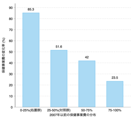 図2:保健事業費の変化率 メタボ健診制度導入前の一人あたり保健事業費の分布別にメタボ健診制度導入後の保健事業費の変化率をまとめたものです。処置群として使用したグループ(0-25%)は制度導入前に保健事業費が最も少なかったグループで、一人当たり保健事業費が85.3%増加しました。対象群として用いたグループ(25-50%)では、増加幅は51.6%で処置群より小さいものでした。