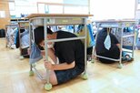 学年ごとに実施し、そなえ館の日岡求(もとむ)施設長は2004年の中越地震で被害を受けた家屋や、崩れた道路など当時の状況を説明。「階段で地震が来たらどうするか」といった三択のクイズに挑戦し、校内で災害が起きた際に気を付ける点を考えた。
