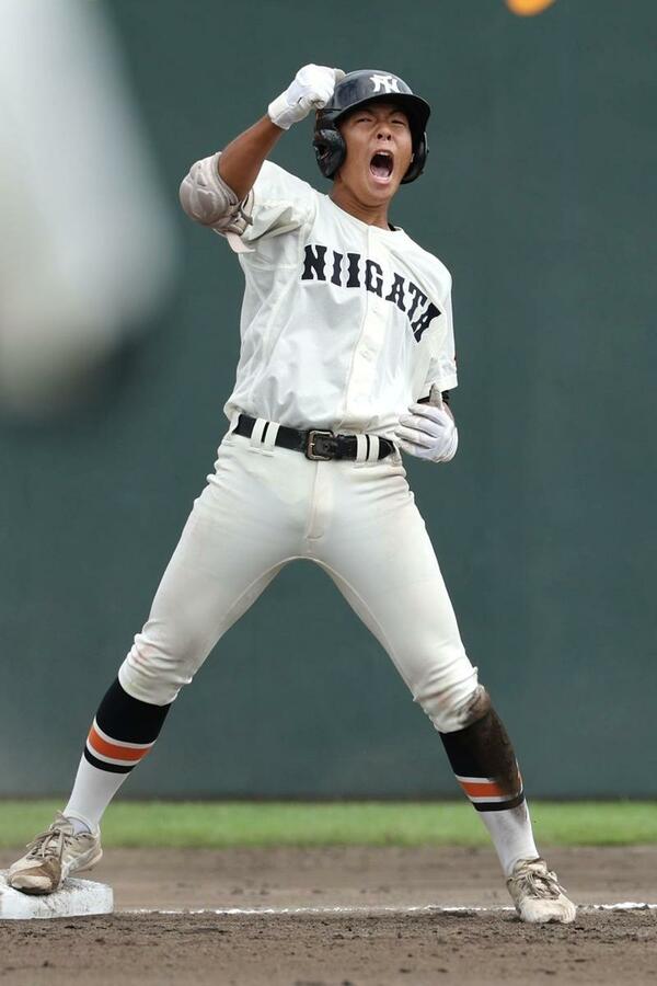 新潟工7回2死一塁、森山穣が勝ち越しの適時三塁打を放ち、ガッツポーズ。4-3=三条市パールスタ