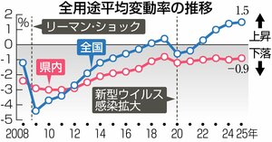 住宅地の県平均変動率はマイナス1・0%と、28年連続で下落。下げ幅は前年よりも0・1ポイント縮小した。上昇は前年と変わらず59地点だった。都道府県別の変動率順位は島根、愛媛と並び43位にとどまった。