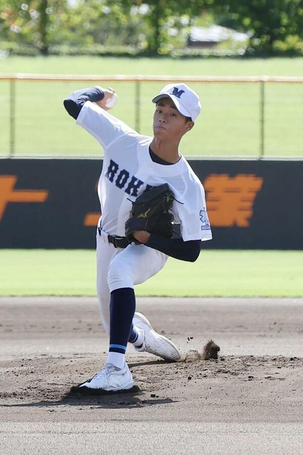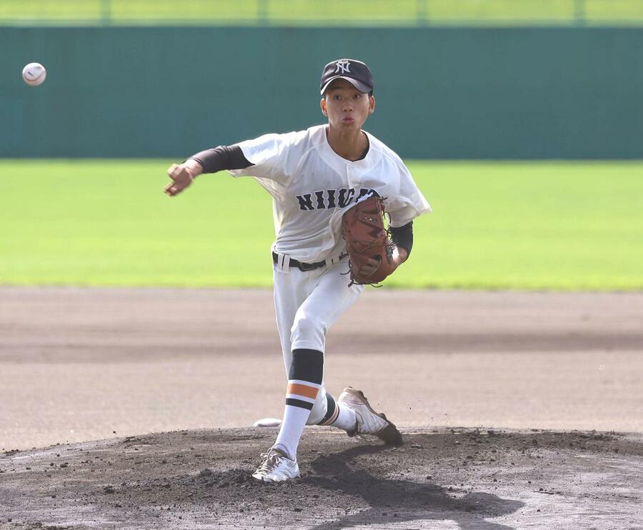 六日町-新潟明訓 新潟明訓打線を3点に抑えた六日町の主戦岡﨑來=9月19日、三条市パールスタ