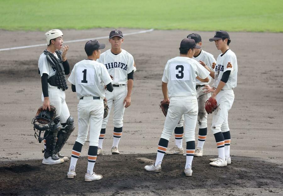 長岡大手-新潟工 五回、マウンドに集まる新潟工ナイン=19日、柏崎市佐藤池