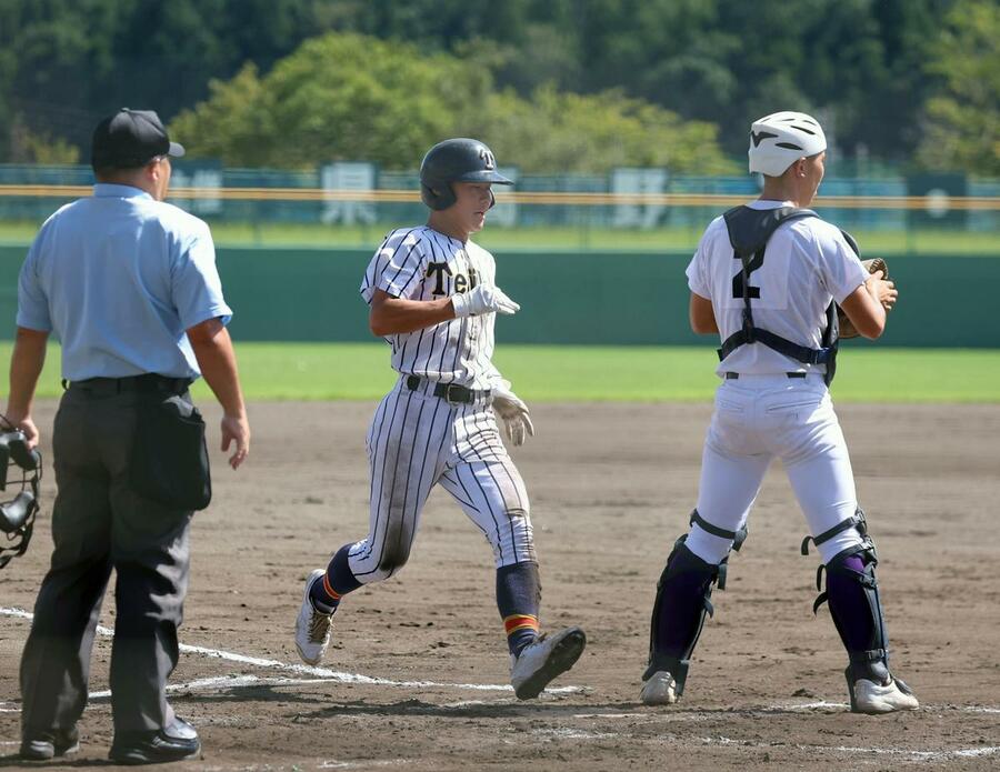 帝京長岡-東京学館 一回、先制のホームを踏む帝京長岡の富田惇紀=19日、柏崎市佐藤池