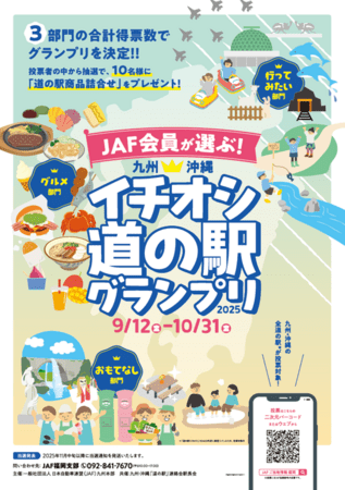 JAF九州本部(本部長 金野 誠)は9月12日(金)~10月31日(金)の期間中、JAF会員が選ぶ!「イチオシ道の駅グランプリ2025」を開催しています。(共催:九州・沖縄「道の駅」連絡会駅長会)