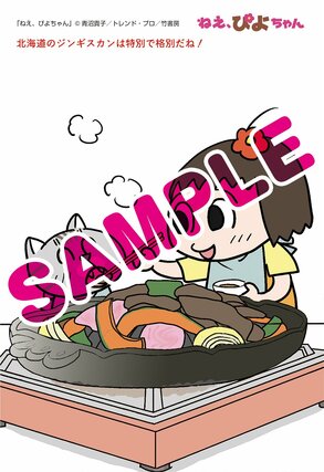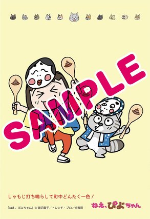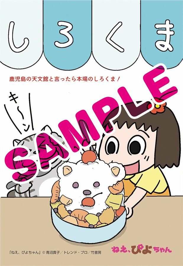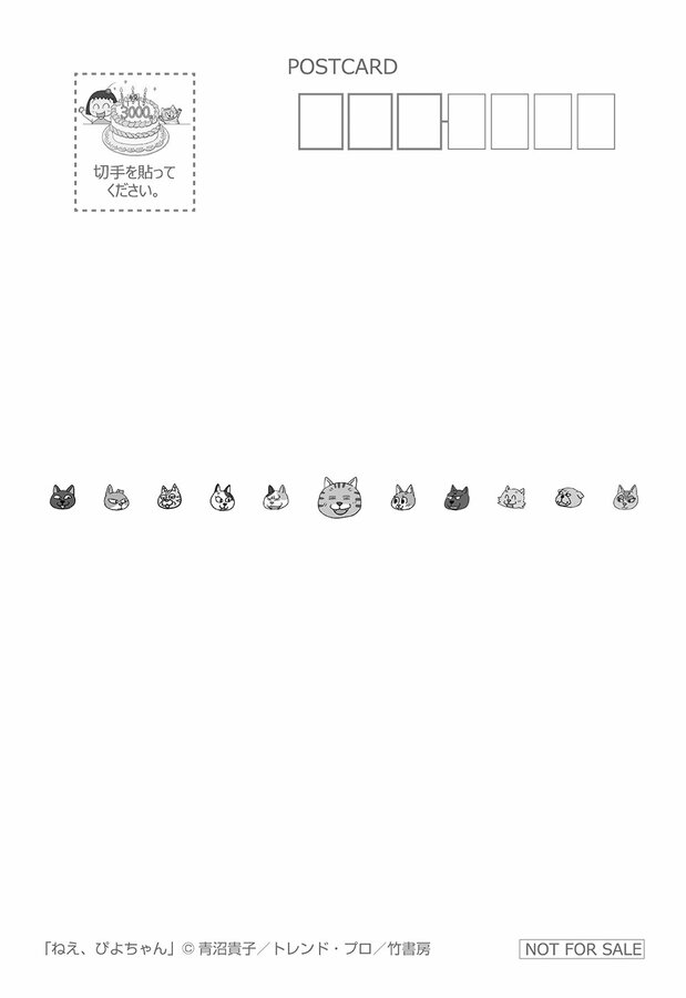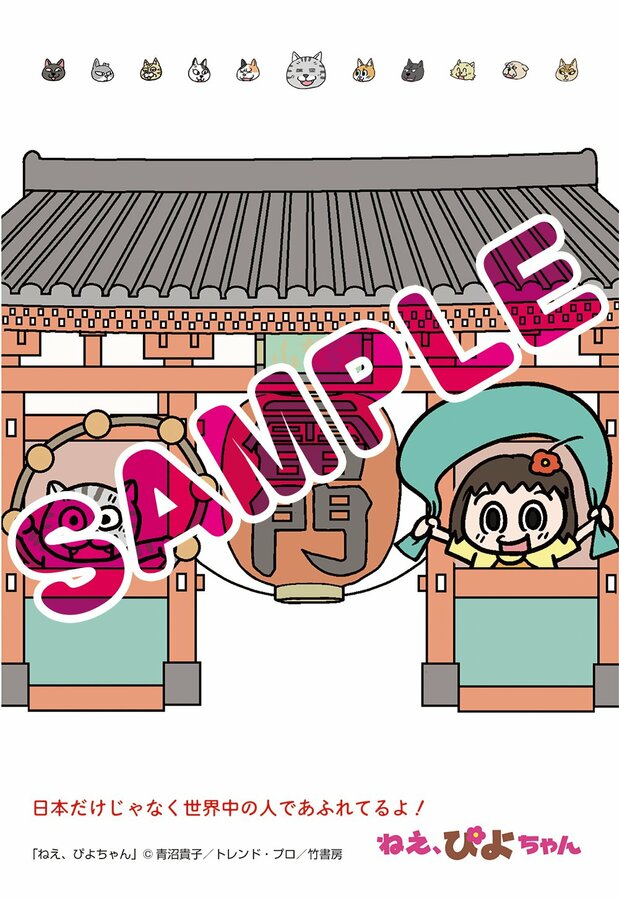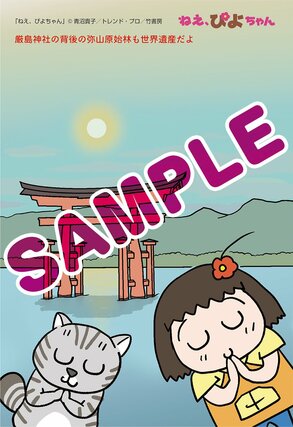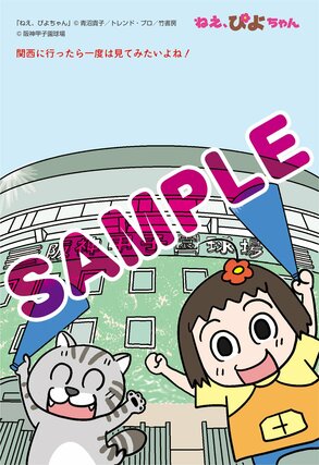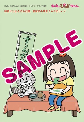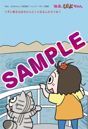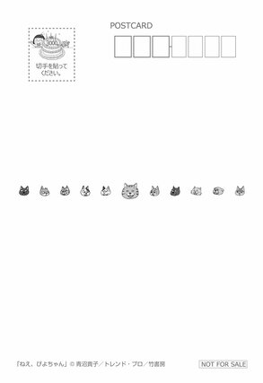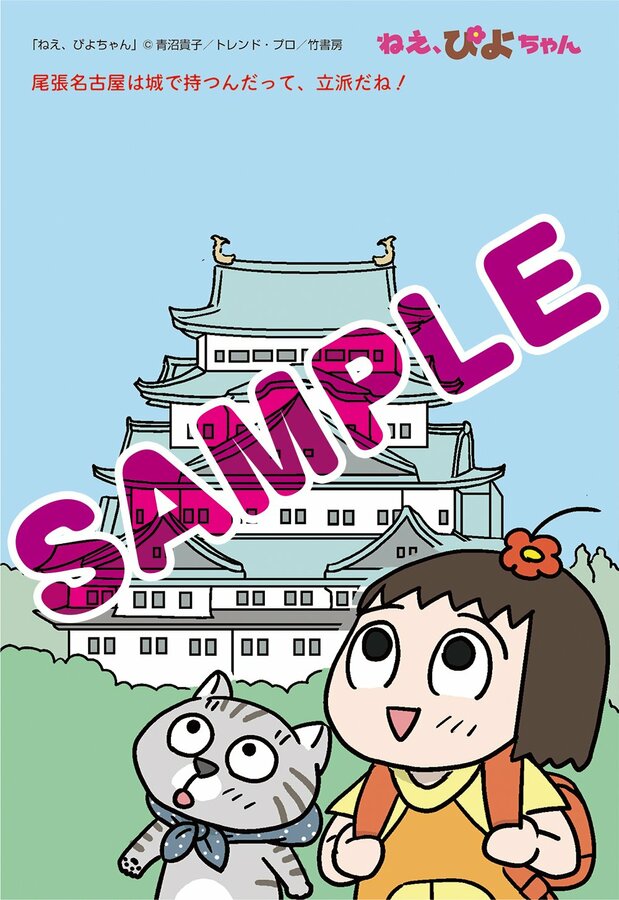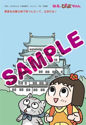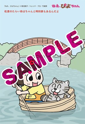 フェアでは書店で各巻を1冊購入するごとに、特典として青沼貴子さん描き下ろしのポストカードが1枚もらえる。各新聞の地元に合わせたイラストは全11種あり、名所やグルメを楽しむぴよちゃんと又吉が描かれている。新潟では、佐渡のたらい舟を楽しんでいる。