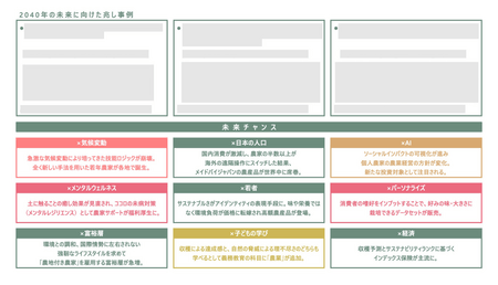 本ツールでは、各テーマのシートが「表面」と「裏面」で2面構成となっており、表面には2040年の未来を考えるために必要な情報(市場規模予測などの定量データを含む)と、これらの情報を基に、人や社会の変化、社会課題など未来の事業を考えるために重要な示唆を記載しています。裏面には、現在起きている具体的な兆しの事例や、2040年の未来で起こり得るビジネス機会を「未来チャンス」として記載しています。