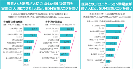 ・大切にしたい項目として挙げた「納得できる治療法であること」を「とても大切にできた」人はSDM実施スコアが82.8ポイントで、大切にできなかった人ほどスコアが低下