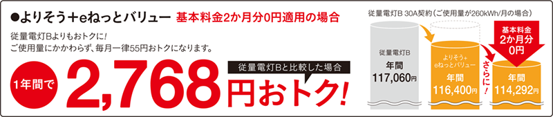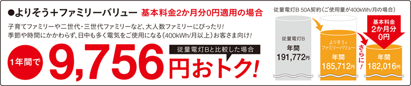「よりそう+eねっとバリュー」と「よりそう+ファミリーバリュー」はどちらも一般的に利用されている従量電灯B・Cと比べて、お得に電気を利用できるのが特徴です。