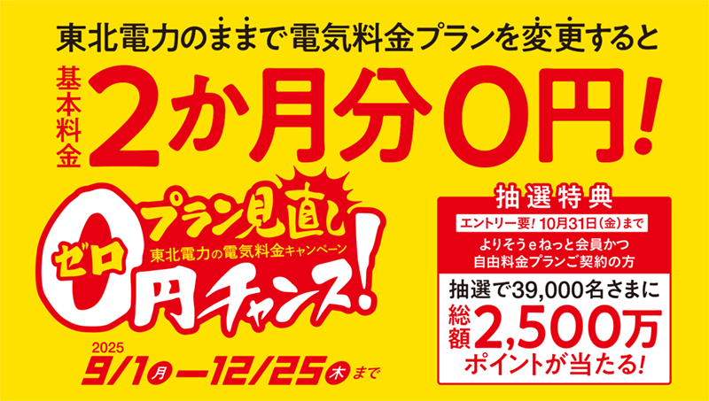 東北電力では、2025年12月25日(木)までに対象のプランへ変更すると、基本料金が2カ月無料になるキャンペーン「プラン見直し0円チャンス!」を実施中。他社からの切り替えも大歓迎です。