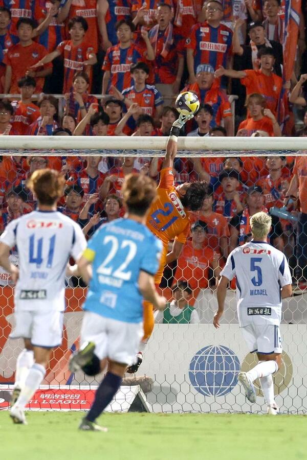 前半、新潟のGK田代琉我のスーパーセーブを見せる=ニッパツ三ツ沢球技場