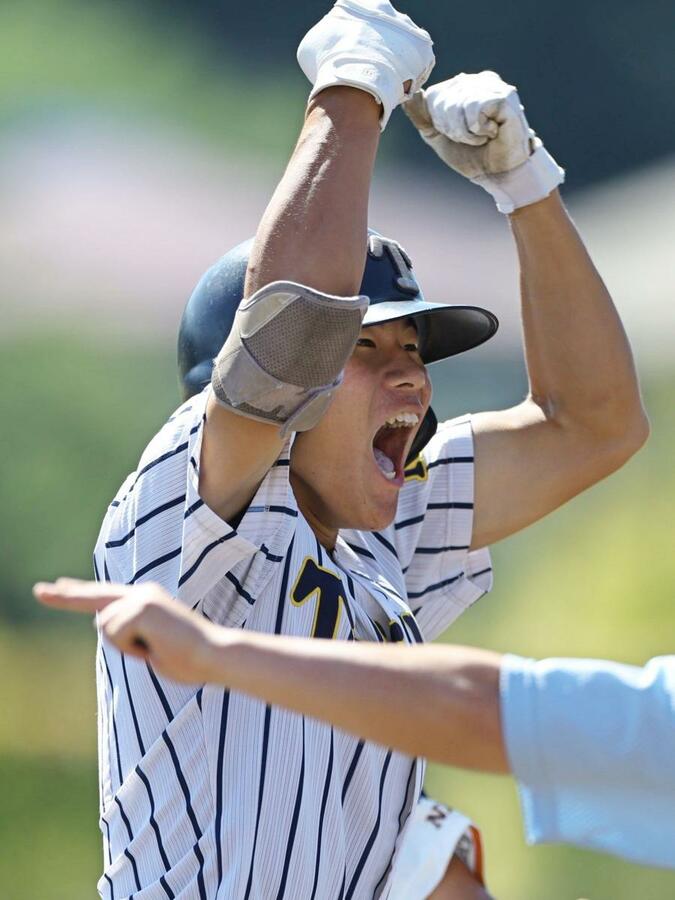 開志学園-帝京長岡 6回帝京長岡1死二塁、富田惇紀が適時三塁打を放ち2-1。三塁上で雄たけびを上げる=9月24日、三条市月岡4の三条パール金属スタジアム
