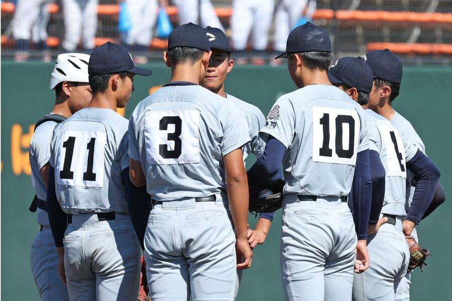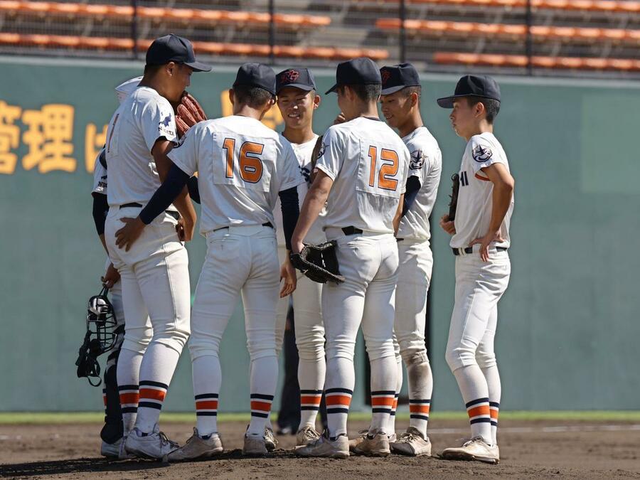 開志学園-帝京長岡 1回のピンチでマウンドに集まる開志学園の選手たち=三条パール
