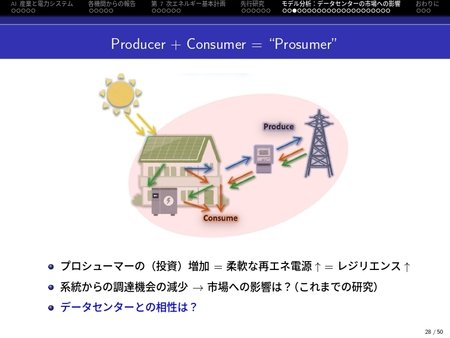 本セミナーでは、予想されるAI計算需要を想定し、DC事業者が直面する経済的課題を整理しました。また、需要急増が電力システム全体に及ぼす影響を検証し、再生可能エネルギー導入が進む中で注目される「プロシューマー」(自ら電力を生産・消費する個人や事業者)の役割に焦点を当て、プロシューマーとDC事業者、それぞれの拡大が社会に及ぼす影響について考察しました。さらに、デジタル変革(DX)とグリーントランスフォーメーション(GX)を同時に推進する政策オプションを提示し、AI駆動社会に必要な電力基盤の構築に向けた具体的なヒントを提案しました。