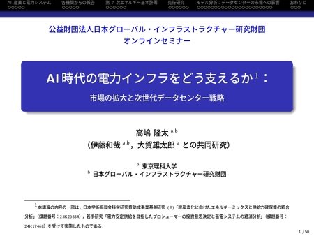 公益財団法人日本グローバル・インフラストラクチャー研究財団(所在地:東京都港区、理事長:中山幹康、略称:日本GIF)は、2025年7月31日(木)午後2時から、Zoomを利用したオンライン形式にて、東京理科大学創域理工学部教授で当財団専務理事の高嶋隆太を講師に、「AI時代の電力インフラをどう支えるか―市場の拡大と次世代データセンター戦略」と題したセミナーを開催しました。