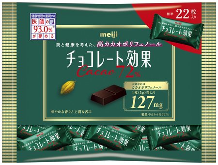 このたび発売する新商品「チョコレート効果カカオ72%袋」は、22枚入りの容量が最大の特長です。「箱タイプでは物足りないけど、大袋タイプでは多すぎる」と感じる方に向けて手に取りやすい容量となっています。個包装で持ち運びしやすく、毎日の習慣として手軽に高カカオチョコレートを取り入れていただけます。発売以来、健康を志向する大人のお客さまに選ばれてきた「チョコレート効果」の新たなラインアップとして、さまざまな生活シーンでご活用いただきたい商品です。