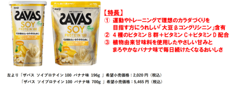 また、植物由来甘味料のステビアを100%使用した「ザバス ソイプロテイン100 バナナ味 196g/700g」を9月29日から全国で発売します。