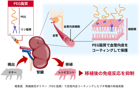 腎移植は重症の腎疾患患者が人工透析を回避できる唯一の治療法で、移植した腎臓が長期にわたって患者の体内で生着することが重要です。そのためには移植時に起こる、臓器の損傷を引き起こす免疫反応を抑制する必要があります。本研究では、ポリエチレングリコール(PEG)とリン脂質との結合体である両親媒性高分子、PEG脂質によるコーティング技術を腎臓内の血管内皮表面に適用することで、腎移植後に起きる免疫反応の一つである虚血再灌流障害が抑制されることを、ブタを用いた動物実験により明らかにしました。