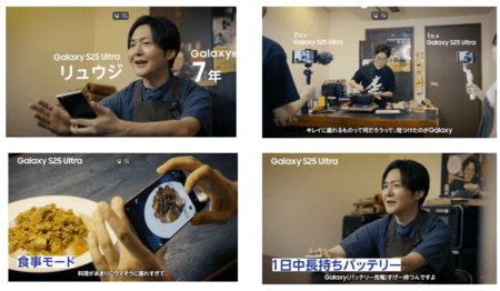新WEB CM『Voices of Galaxy リュウジ篇 | Galaxy S25 Ultra | Samsung』を本日より公開いたします。CMは、いつものキッチンでリュウジさんが虚無レシピを「Samsung Galaxy S25 Ultra」で撮影するシーンから始まり、調理後は、食事モードで完成した料理写真を美しくとらえる様子などが自然なストーリーの中で表現されています。撮影後は「Samsung Galaxy S25 Ultra」上で実際にYouTube動画に活用されるサムネイルを作成。日常の「料理動画制作」を、「Samsung Galaxy S25 Ultra」が高画質な映像撮影やスムーズな編集により可能にしていることを紹介しています。YouTube制作スタッフにも、Samsung Galaxyをお勧めしているリュウジさんのコメントにも注目です。クリエイターにとって欠かせない相棒として、「Samsung Galaxy S25 Ultra」があれば、撮影から配信までを1台だけで完結できるというメッセージを語っています。