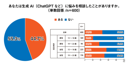 生成AIに悩みを相談した経験は「ある」が44.7%でした。性年代別でみると女性15~18歳は特に高く55.1%が「ある」と答えていますが、男性15~18歳は21.1%しかありませんでした。