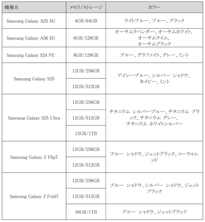 <Samsung Galaxyスマートフォン取り扱い製品一覧>