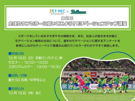 ティーペック株式会社(本社:東京都台東区、代表取締役社長:鼠家 和彦)は、Jリーグクラブ「湘南ベルマーレ」との共同企画として、心理カウンセラーによる 「第2回ティーペック×湘南ベルマーレ 心理カウンセラーに聞いてみよう!モチベーションアップ講座」 を2025年10月19日(日)にレモンガススタジアム平塚(神奈川県平塚市)で開催いたします。