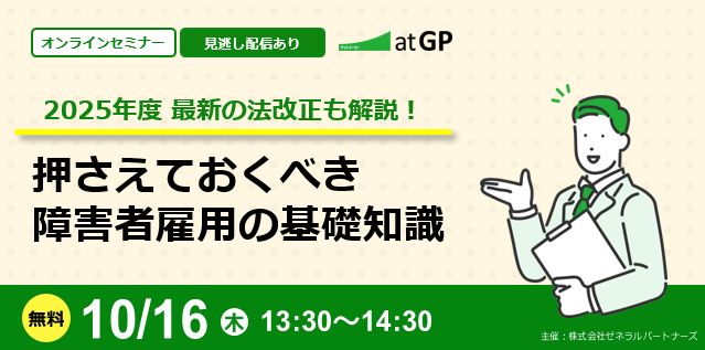 障害者の就労支援を中心にソーシャルビジネスを展開する株式会社ゼネラルパートナーズ(本社:東京都千代田区、代表取締役社長:進藤均)は、4月24日に開催し好評をいただいた「障害者採用の基礎知識」セミナーのアンコール配信を2025年10月16日(木)に実施いたします。