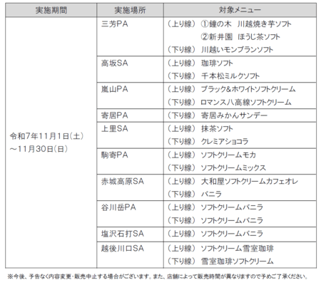 ②関越道の以下のSA・PA(計18か所)では、40周年にちなんで、おすすめソフトクリームを40円引きで提供します。