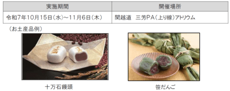 ①関越道沿線のお土産品を集めた関越道物産展を開催します。普段は買うことのできないようなお土産品を特別にお買い求めいただける貴重な機会ですので、お出かけの際には是非お立ち寄りください。