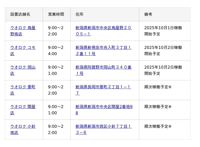 鳥屋野南店、コモ店、岡山店の3店舗では、2025年10月1日(水)より順次稼働を開始する予定です。残る3店舗についても順次稼働を予定しており、地域のお客様が日常のお買い物の合間にスムーズなEV充電をご利用いただける環境を整備してまいります。