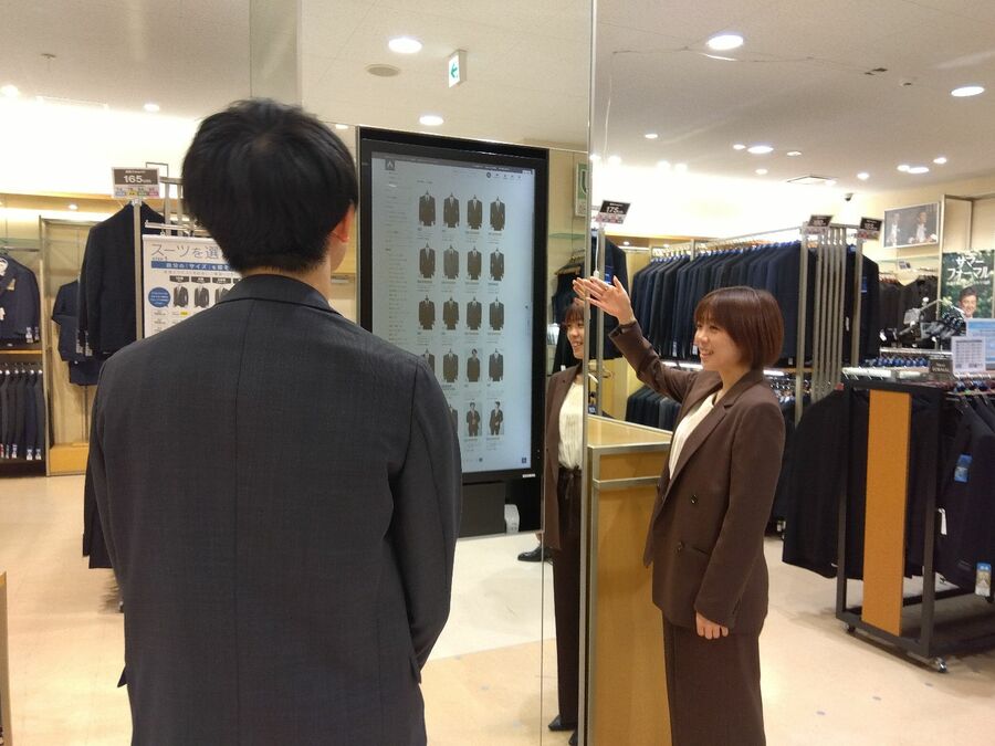 『デジラボ』は、ネット連携による豊富な品ぞろえとリアル店舗の接客サービスの両メリットを最大限にいかした当社の独自システムです。導入店の店内には、全店の在庫と連動するタッチパネル式の大型サイネージ(一部店舗)やタブレット端末を複数設置。お客様はこれらの端末を使い、全国に展開する「洋服の青山」の1,000万点以上ある豊富な品ぞろえの中からお好みの商品を選ぶことができるとともに、販売員の接客を受けながら実際の商品の色柄や着心地を確認した上で購入することもできます。