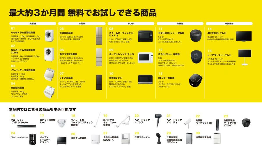 アンビション DX ホールディングスの管理物件では、洗濯機や冷蔵庫などの生活必需家電から、掃除機やヘアードライヤーなどの小物家電までを網羅した「自由に選べる家電プラン」から、新規入居者や既存居住者が自由に選び、組み合わせて利用できます。初回お申込み時には、「自由に選べる家電プラン」の中から大型家電を中心にした15点を対象に、約3か月間無料でお試しできます。