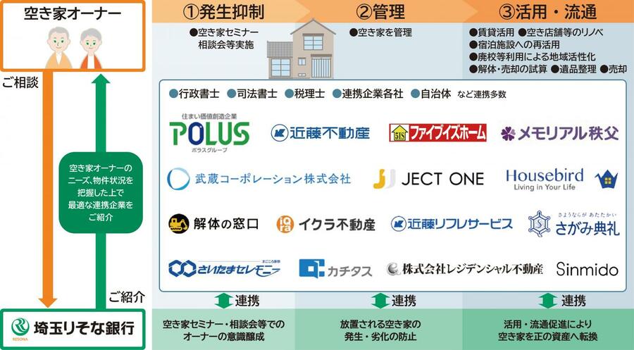 『空き家等の有効活用等の促進に関する連携協定』は、深刻化する空き家問題の解決に向け埼玉りそな銀行が進める「空き家まるごと解決システム」の一環です。この協定に基づき、空き家の①発生抑制、②管理、③活用・流通等、各段階で、当社を含め様々な事業者と連携し、オーナーや利用者に最適なソリューション提案やサービスを提供します。本サービスは、本日9月29日から提供を開始します。