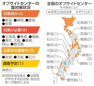 原子力災害が起きた際に行政や電力会社の拠点となるオフサイトセンター原子力災害時に行政や電力会社など専門家や関係者が集まり、情報共有や緊急対応の調整・指揮をするための施設。緊急事態応急対策拠点施設という。内閣府によると、原子力発電所や試験研究用の原子炉、核燃料加工施設などがある16道府県に23施設が設置されている。施設には放射線対策の設備や非常用電源も備える。で求められている落雷対策について、センターがある16道府県のうち、少なくとも8道府県で対応が未了で、追加整備が必要であることが28日、共同通信の調査で分かった。8月時点の状況として各自治体の回答をまとめた。ほか8県は、4県が必要性を調査中または調査予定で、完了は4県にとどまった。緊急時に即応が必要な施設で、災害対応が進んでいない状況が明らかになった。