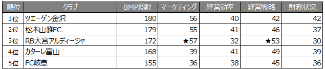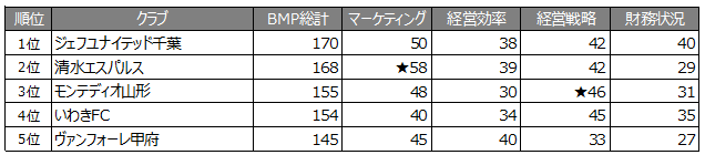 BMポイントが同率の場合、マーケティング、経営効率、経営戦略、財務状況の順で順位が上のクラブを上位とする。