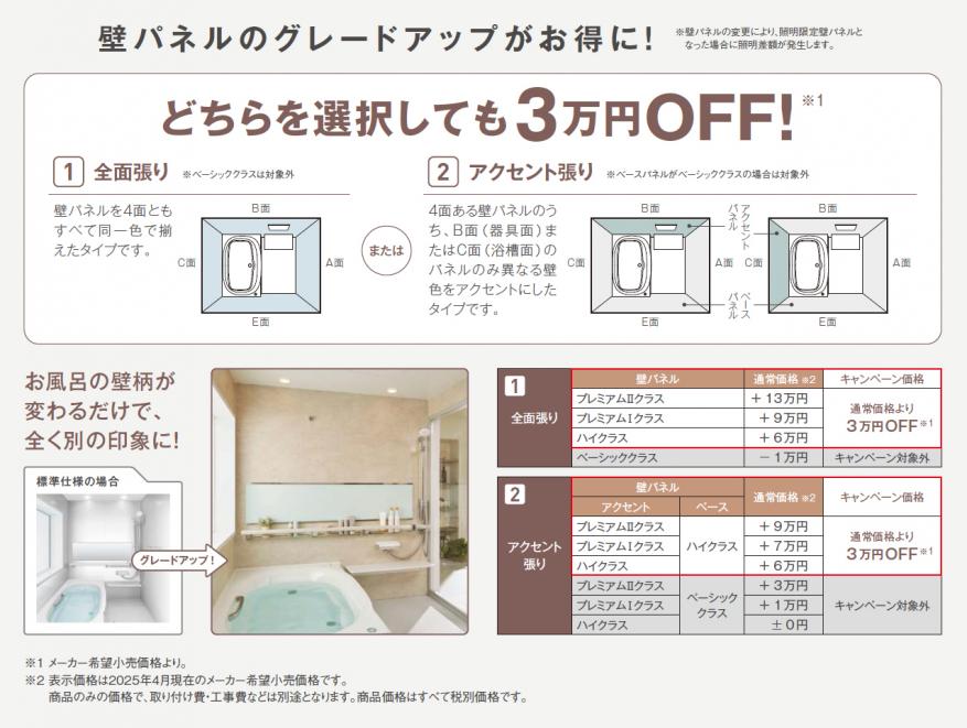 ・実施内容:浴室の壁パネルのグレードアップが3万円OFF(メーカー希望小売価格より)
