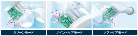 タテ方向とヨコ方向の立体的な振動を組み合わせた3つのモードを搭載しています。歯の表面だけでなく歯のすき間や凹凸に毛先が入り込み、歯垢を効果的に除去する「クリーンモード」、毎分33,000回で毛先がタテ方向に大きく振動し、前歯の裏側や奥歯など磨きにくい場所の歯垢をかき出す「ポイントケアモード」、歯の側面に対して毛先が平行に大きく動き、やさしく歯垢を除去する「ソフトケアモード」の3つのモードで、歯の形状やケア目的に合わせた効果的なブラッシングが可能です。
