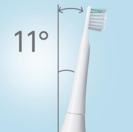 ブラシヘッドを振動させるモーターを小型化してブラシの取り付け部に配置することで、ブラシヘッドを 11°傾けました。これにより歯とブラシの間にすき間ができにくくなりより自然な姿勢で奥歯を磨くことができます。