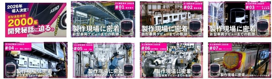 株式会社総合車両製作所の全面協力のもと、2000系製作工程の様子を京王電鉄公式YouTubeチャンネルで公開しています。現在「#1構体製作」「#2構体総組」「#3トラバーサーによる車体移動」「#4床下屋根上機器吊り」「#5内装・ぎ装」「#6台車枠製缶・台車総組」「#7塗装・ラッピング」を公開中です。運行開始まで順次製作工程などを公開します。