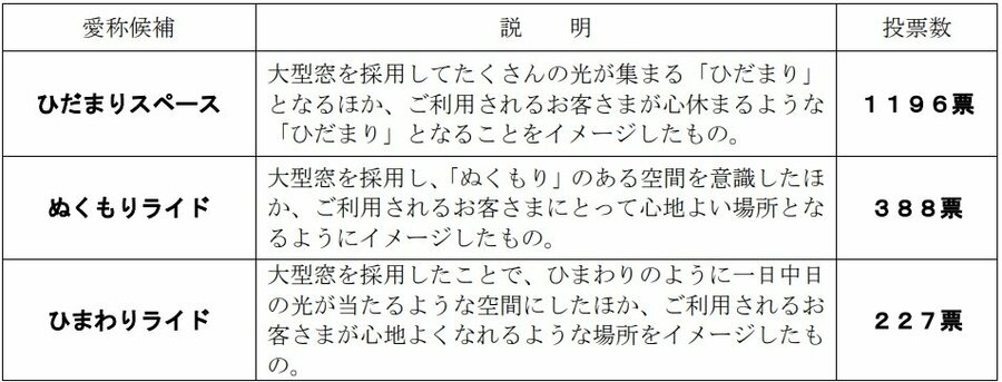 2025年5月7日から6月10日までの期間、多くのお客さまに親しみを持っていただくために実施した「大型フリースペース(仮称)」愛称投票の結果、3つの候補の中から最も投票数が多かった「ひだまりスペース」に決定しました。
