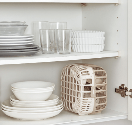 コンパクトにまとめられ、食洗機庫内のスペースを取りません。ケース内の仕切り棚は食器のサイズにあわせて高さが変えられます。