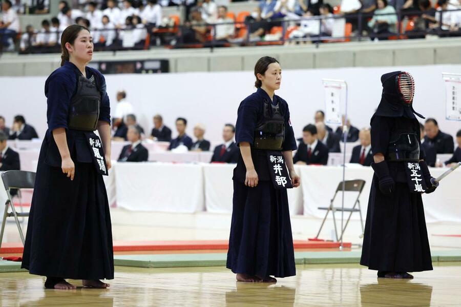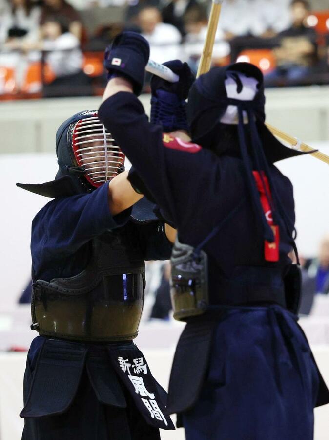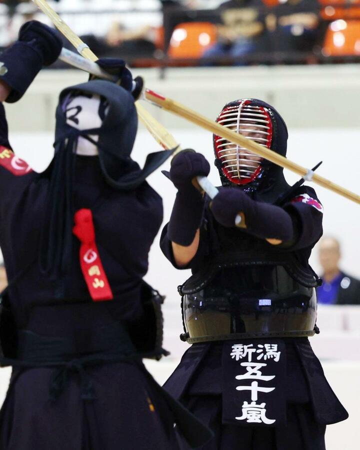 成年女子準々決勝 岡山-新潟 新潟の大将五十嵐しのぶ(新潟翠江高教)が攻める=滋賀県湖南市