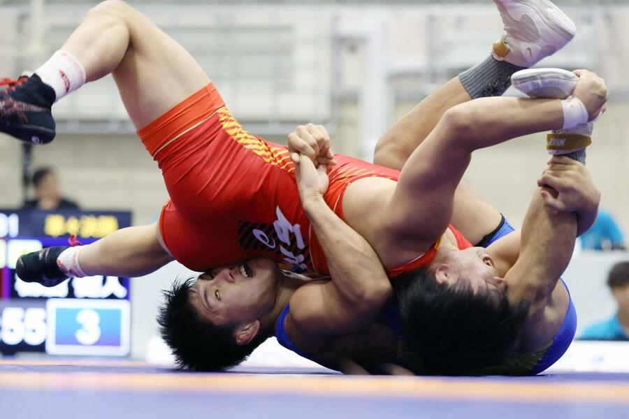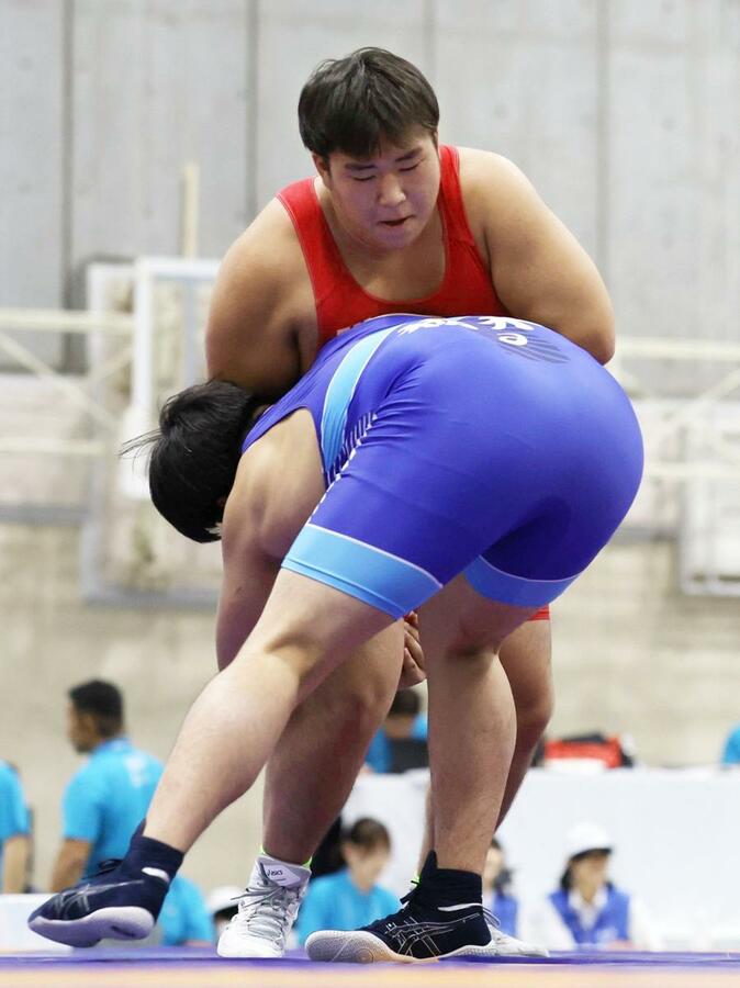 少年男子フリースタイル125キロ級準々決勝 相手の猛攻に耐える赤塚晟結(左・県央工高)=滋賀県栗東市