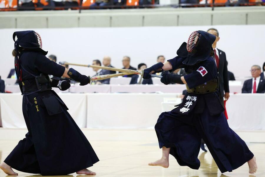 成年女子準々決勝 相手とつば競り合う先鋒の風間達子(左・五泉市役所)=滋賀県湖南市