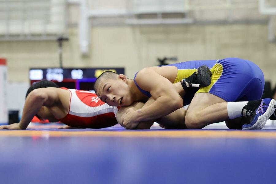 成年男子フリースタイル65キロ級準々決勝 攻め手を探る及川丈尊(左・日体大)=滋賀県栗東市