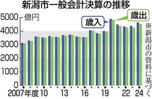 新潟市は9月30日までに、2024年度の一般会計などの決算を発表した。一般会計の歳入は前年度比5・7%増の4635億4455万円、歳出は前年度比6・3%増の4521億3337万円。決算額としてはいずれも過去最大だった20年度決算に次ぐ規模となった。能登半島地震への対応や人件費増などが要因。財政の豊かさを示す財政力指数(3カ年平均値)は8年連続で低下した。