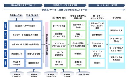 新商品・サービス開発の推進・伴走支援にあたり、当社はさまざまな業種・企業向けのサービスで実績を有するリード人財約40人を結集し、バーチャル組織「新商品・サービス開発Expert Hub」を新たに発足させることにしました。企業のニーズに合わせ、戦略コンサルティング、マーケティング、データ、PR、プロモーション、クリエイティブなどの専門人財を配置することで、柔軟なプロジェクト設計が可能です。例えば、コンセプトの構想、技術を生かした新商品・サービスの開発だけではなく、価格戦略や事業計画の立案、新商品・サービスに関わる顧客体験までを具体化します。