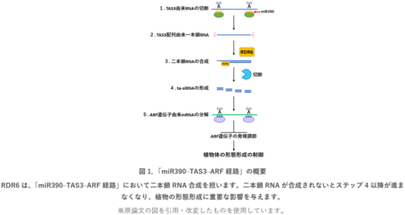 rdr6植物体ではRNAサイレンシング機構を抑制するためにRDR6遺伝子を破壊しています。一方で、RDR6遺伝子は「miR390–TAS3–ARF経路」と呼ばれる遺伝子制御経路においても重要な役割を担っていることが知られています。この経路は、植物の葉や花などの器官形成を制御するうえで不可欠な「ARF遺伝子(オーキシン応答因子遺伝子)」の発現を調節する仕組みです(図1)。